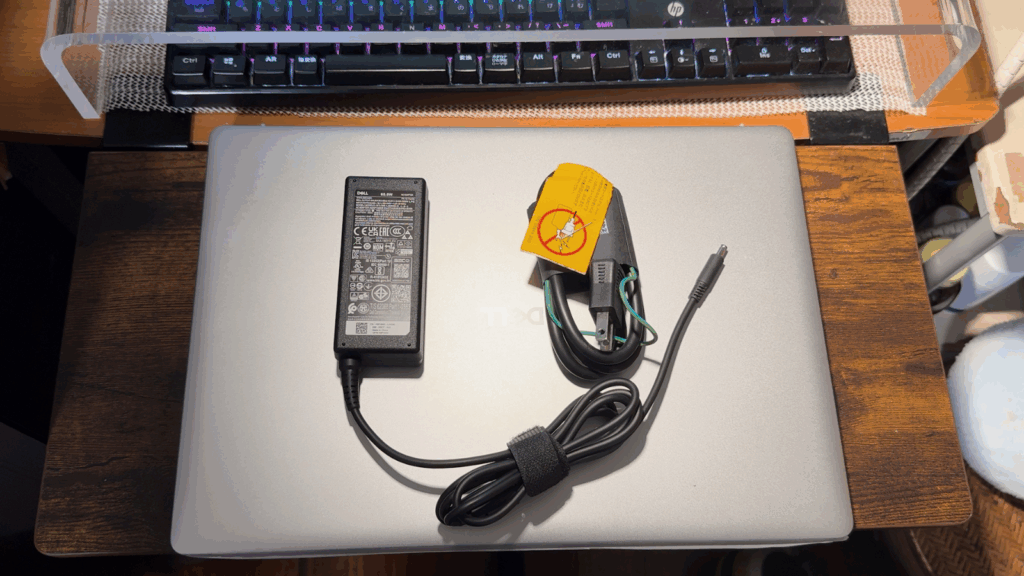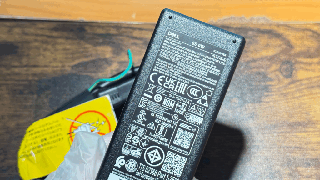 付属のACアダプタ(65.0W)は見慣れた形だけど、AMD構成らしいワット数でほどよく軽い。